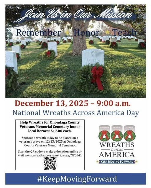 Last year, ceremonies were held across the country at 4,909 participating locations, placing more than 3 million sponsored veterans’ wreaths for servicemembers laid to rest. This year Wreaths Across America Day will be held on Saturday, December 13, 2025, at 9 am at the Onondaga County Veterans Memorial Cemetery, 4069 Howlett Hill Road, Syracuse, NY 13215. Wreath removal is scheduled for 1/31/2026 at 9:00 am.